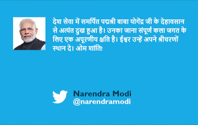 In a tweet, the Prime Minister said, “Deeply saddened by the passing away of Padma Shri Baba Yogendra ji, dedicated to the service of the nation. His demise is an irreparable loss to the entire art world. May God give him a place at his feet. om Shanti!”