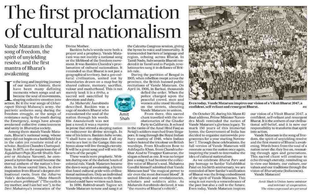 New Delhi, 7th Nov: Prime Minister Narendra Modi on Thursday shared an article by Union Minister Shri Amit Shah reflecting on India’s national song, Vande Mataram, composed by Bankim Chandra Chattopadhyay, calling it the eternal song of India’s freedom.