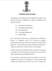 New Delhi, 18th Oct. The Supreme Court Collegium has recommended five advocates for appointment as the Judges of Punjab and Haryana High Court.