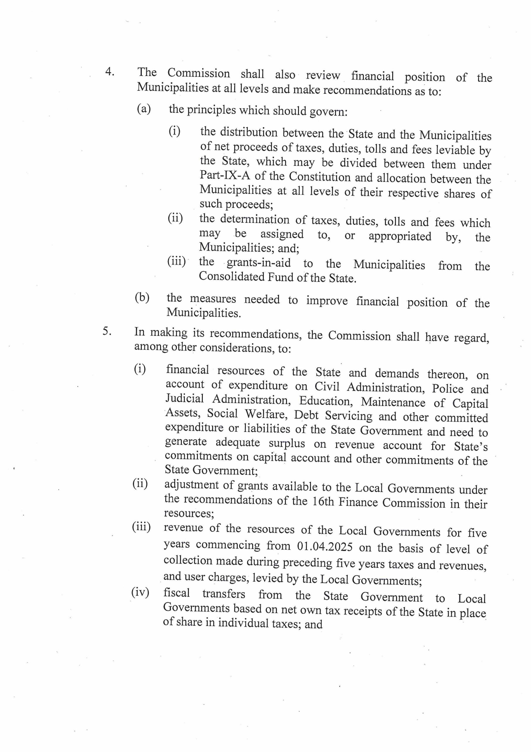 The commission is also tasked with recommending measures to improve the financial position of these local bodies and suggesting the amount of grants-in-aid they should receive from the Consolidated Fund of the State.
