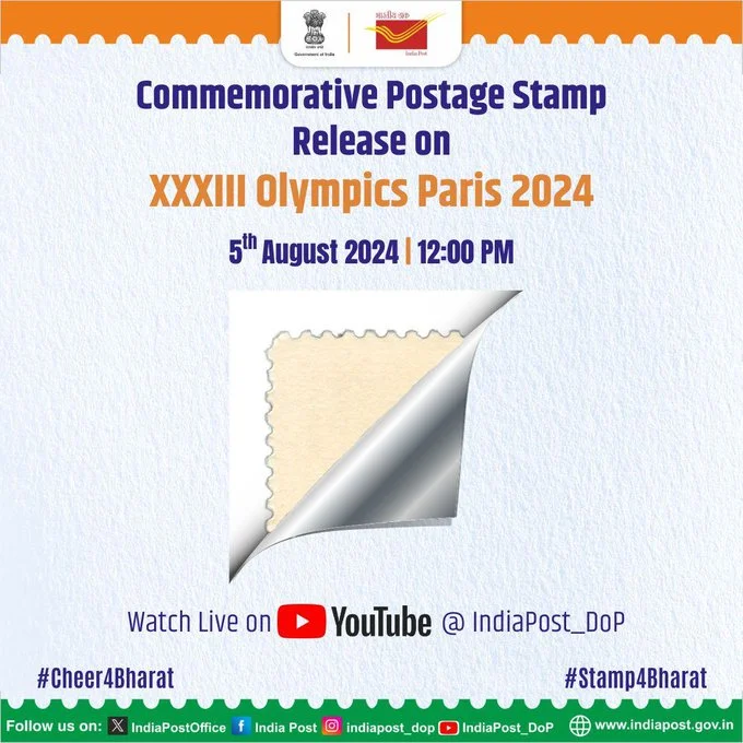 New Delhi, 5th August. The Department of Posts will release a set of commemorative postage stamps to celebrate the Paris Olympics on Monday, August 5, 2024, at 12:00 PM at Rang Bhawan, All India Radio, New Delhi. The event will be graced by the presence of Union Ministers Jyotiraditya M. Scindia and Dr. Mansukh Mandaviya.