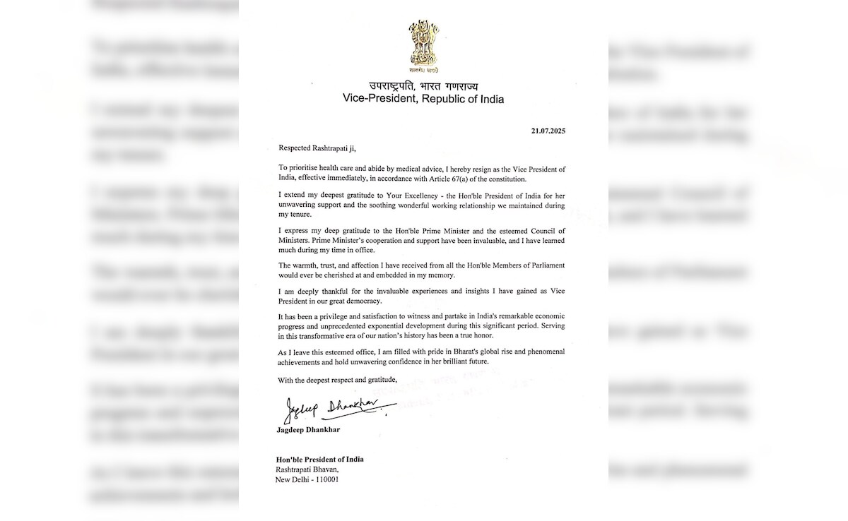 In a letter addressed to President Droupadi Murmu, Dhankhar stated, “To prioritise health care and abide by medical advice, I hereby resign as the Vice President of India, effective immediately, in accordance with Article 67(a) of the constitution.” Article 67(a) of the Indian Constitution stipulates that a Vice-President may resign his office by writing under his hand addressed to the President.