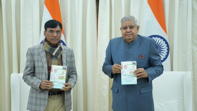 New Delhi, 19th Jan. Vice President Jagdeep Dhankhar released a book on Wednesday titled “Fertilising the Future: Bharat’s March Towards Fertilizer Self-Sufficiency,” authored by Dr. Mansukh Mandaviya, Minister of Chemicals and Fertilizers.