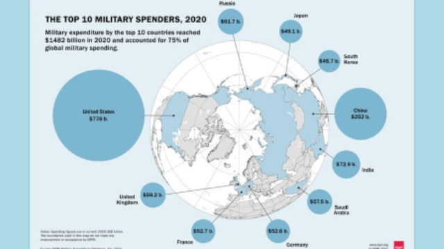 According to the Stockholm International Peace Research Institute (SIPRI), global military spending increased to $2113 billion last year, with the United States, China, India, the United Kingdom, and Russia being the top five spenders.